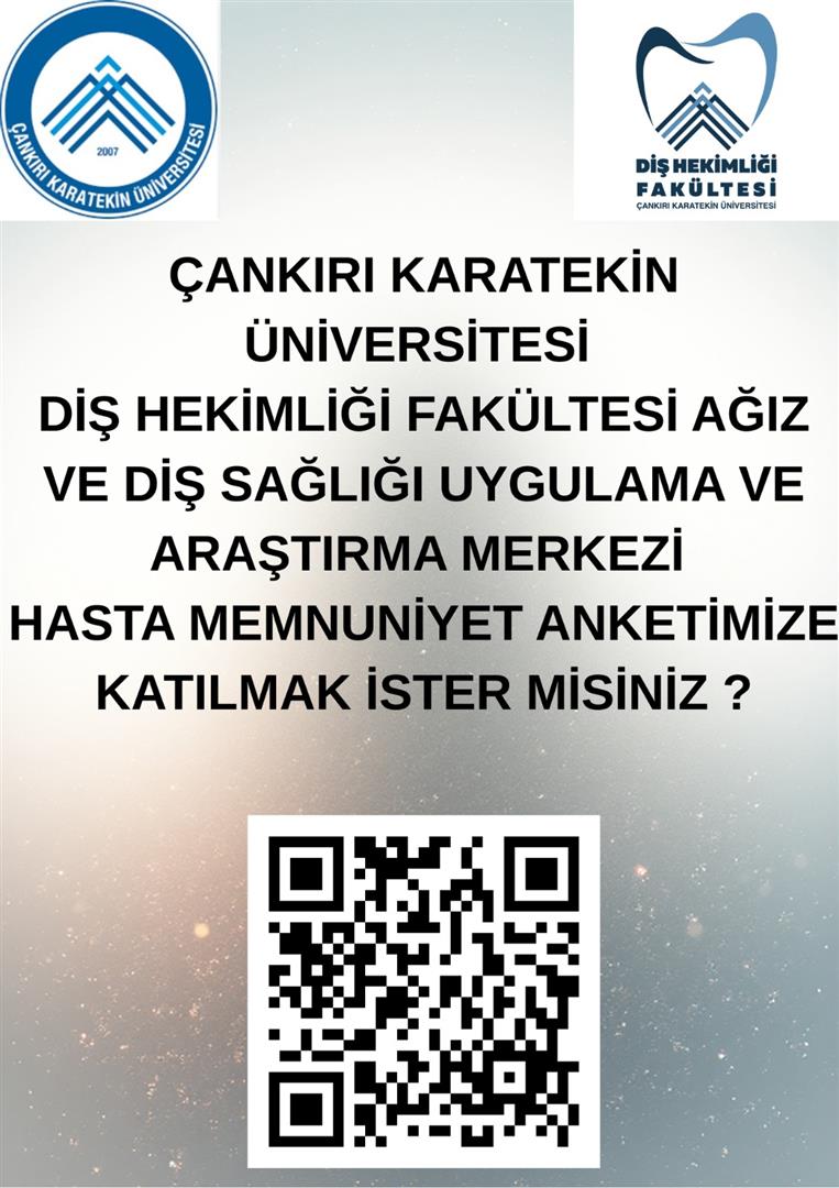 Çankırı Karatekin Üniversitesi Diş Hekimliği Fakültesi Ağız ve Diş Sağlığı Merkezi olarak, hastalarımıza sunduğumuz hizmetlerin kalitesini artırmayı hedefliyoruz. Bu doğrultuda hazırladığımız hasta memnuniyet anketimize katılarak görüşlerinizi bizimle paylaşırsanız memnuniyet duyarız. Değerli katkılarınız için teşekkür ederiz.